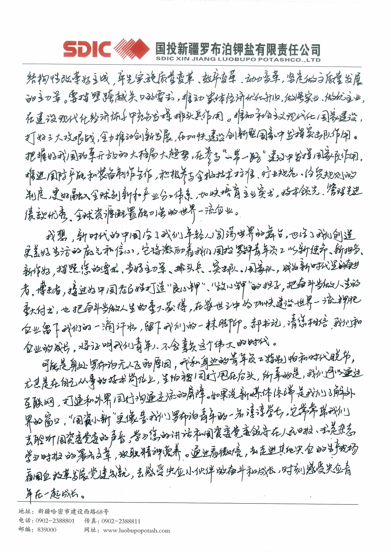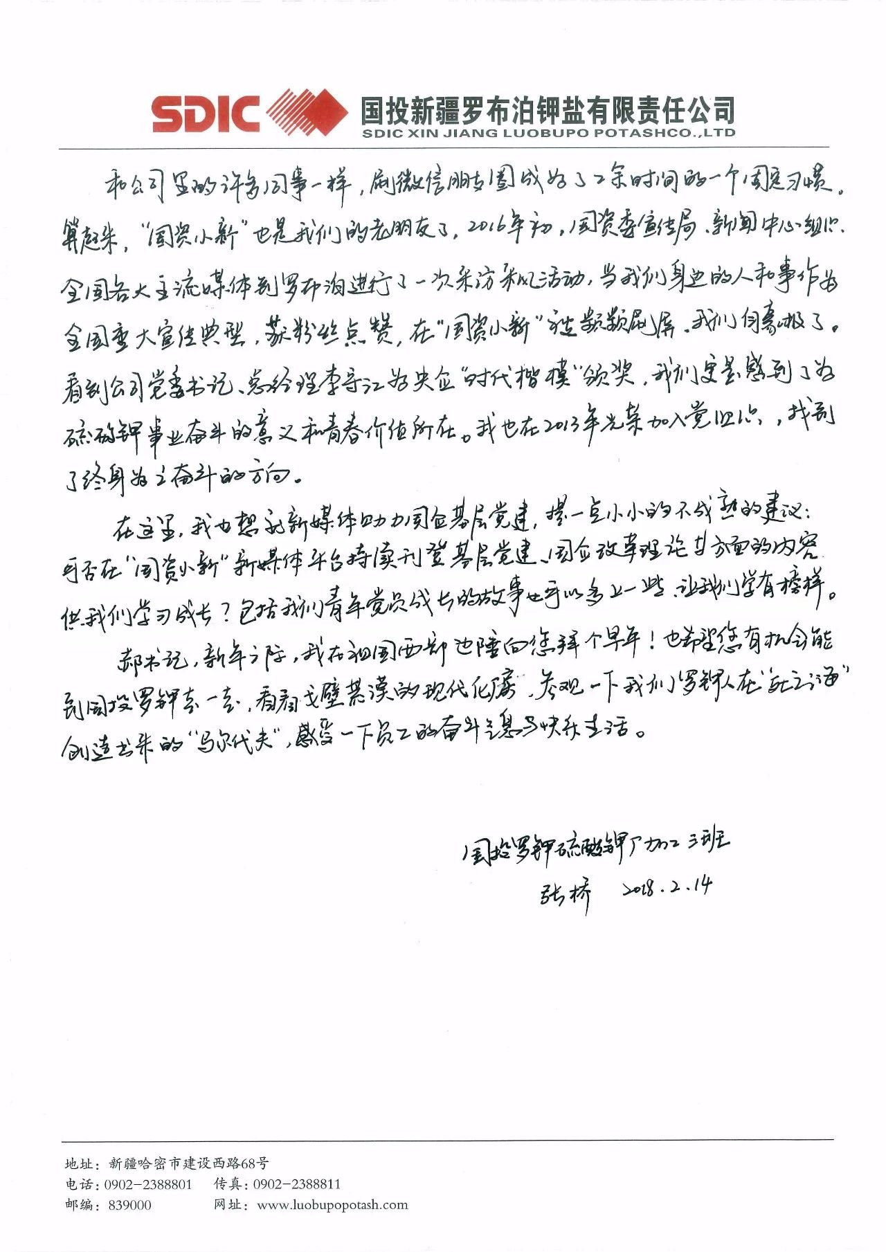 這封寫給郝鵬書記的信,來自國(guó)投新疆羅布泊鉀鹽有限責(zé)任公司硫酸鉀廠加工車間加工三班的一位普通青年員工。