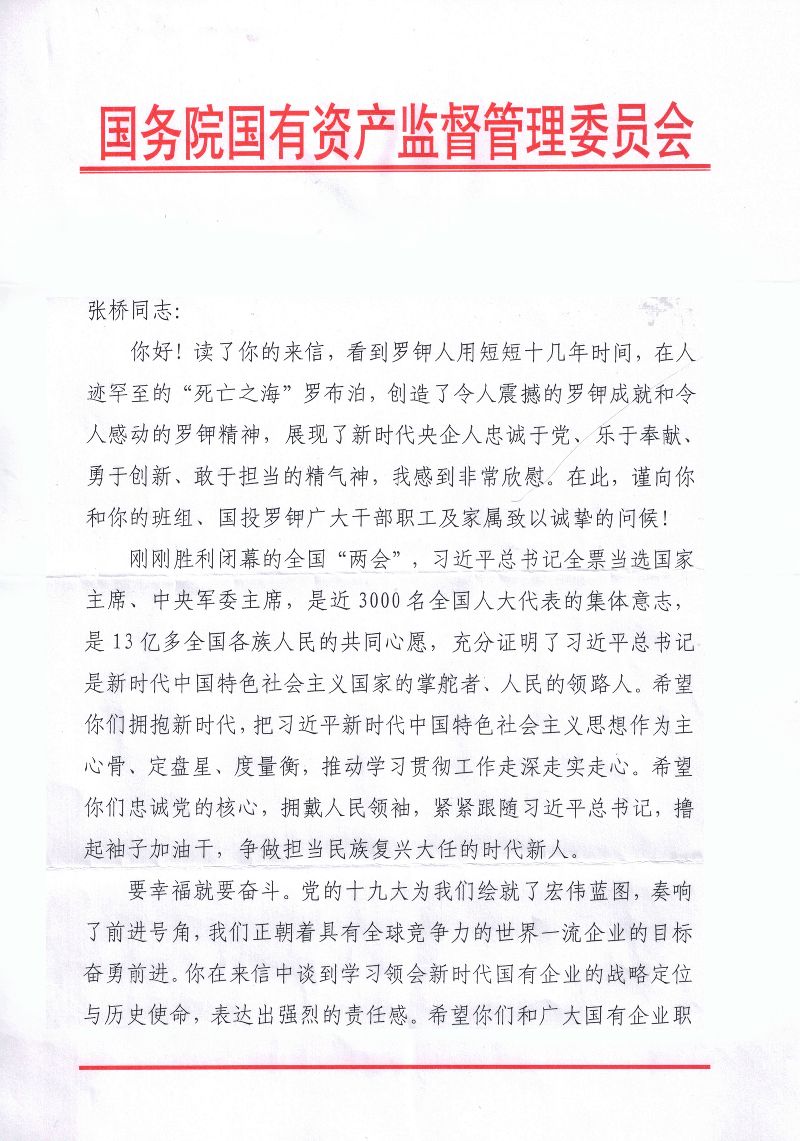我是國(guó)投新疆羅布泊鉀鹽有限責(zé)任公司的一名普通的85后員工。前幾天,通過“國(guó)資小新”微信看到了您在接受《求是》雜志專訪的《新時(shí)代國(guó)有企業(yè)的戰(zhàn)略定位與歷史使命》文章,受益匪淺。您的思考,通篇貫徹著習(xí)近平新時(shí)代中國(guó)特色社會(huì)主義思想,為我們講述了新時(shí)代國(guó)有企業(yè)的戰(zhàn)略定位、歷史使命和改革發(fā)展的新目標(biāo)新舉措,不僅解開了我們基層員工的一些思想困惑,也指明了我們國(guó)企未來的發(fā)展方向。所以,就想通過寫信的方式和您交流一下學(xué)習(xí)心得。