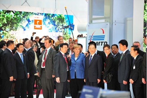 李新亞院長就參展AGV小車的技術(shù)特點、應(yīng)用領(lǐng)域、運行方式等情況向溫家寶總理和默克爾總理做了詳細匯報,溫家寶總理和默克爾總理對AGV產(chǎn)品高度關(guān)注,與李新亞院長親切握手。