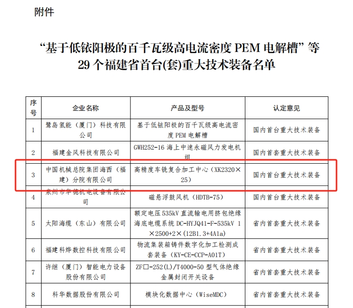 近日,福建省工信廳發(fā)布了《關(guān)于公布“基于低銥陽極的百千瓦級高電流密度PEM電解槽”等29個(gè)福建省首臺(套)重大技術(shù)裝備的通知》,海西分院開發(fā)的“高精度車銑復(fù)合加工中心(XK2320×25)”榮獲國內(nèi)首臺重大技術(shù)裝備認(rèn)定。
